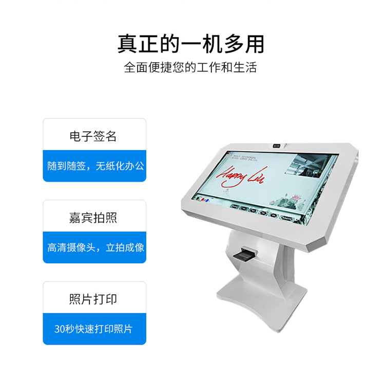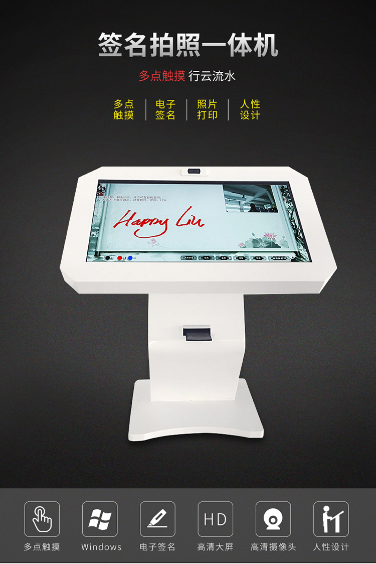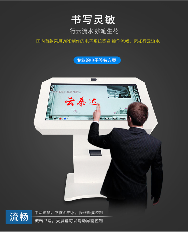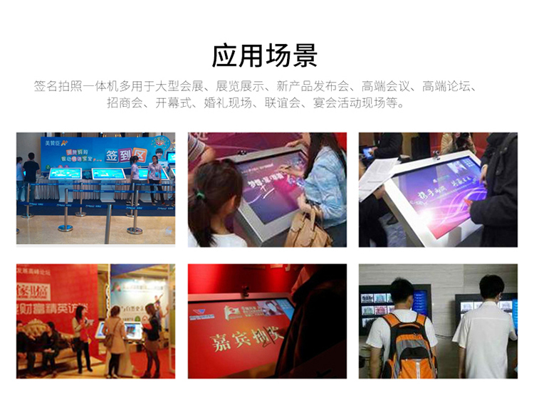 電子簽名拍照系統(tǒng)作為新一代多媒體留言冊(cè),將數(shù)字毛筆簽名影像捕捉、影像合成、配音配樂、多屏顯示技術(shù)、信息統(tǒng)計(jì)、實(shí)時(shí)打印等技術(shù)融為一體,配備多點(diǎn)觸摸屏、大容量硬盤、高清攝像機(jī)、外接LED及液晶拼接等大屏幕終端設(shè)備,實(shí)現(xiàn)互動(dòng)的多媒體終端設(shè)備的高科技互動(dòng)產(chǎn)品。來訪者可以在液晶屏上進(jìn)行自由的書寫,發(fā)表參觀感言、提寫寶貴意見、留下紀(jì)念。內(nèi)容由多媒體留言板以錄屏模式記錄存儲(chǔ),使游客寫畫在手寫屏上的任何文字、圖形或插入的任何圖片都可以被保存至硬盤存儲(chǔ)設(shè)備,并可供館方服務(wù)人員和其他游客查詢、瀏覽。