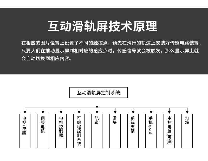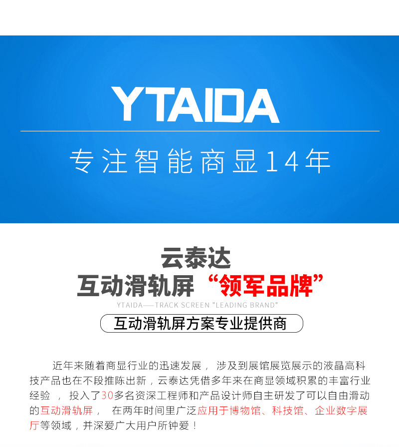 主營(yíng)業(yè)務(wù):滑軌屏、全息展示柜、觸摸一體機(jī)、廣告機(jī)等;