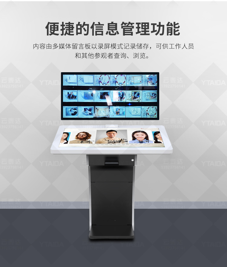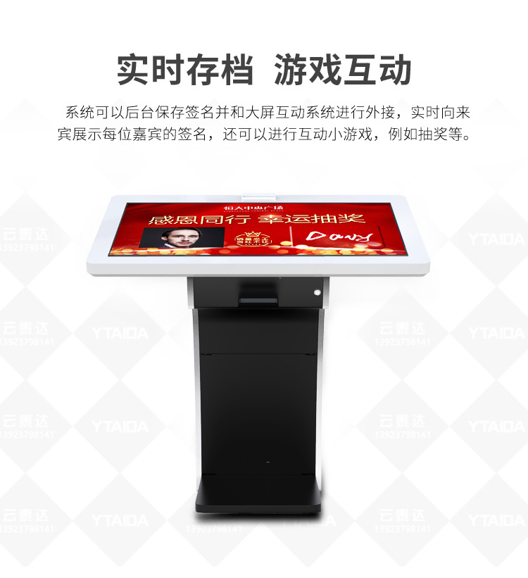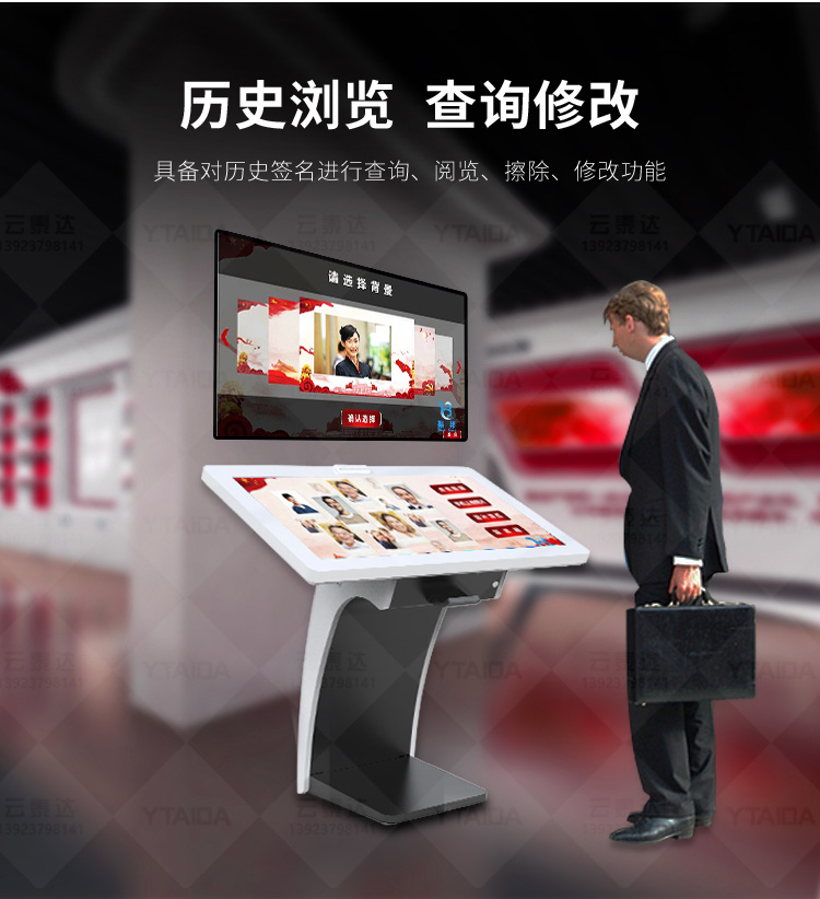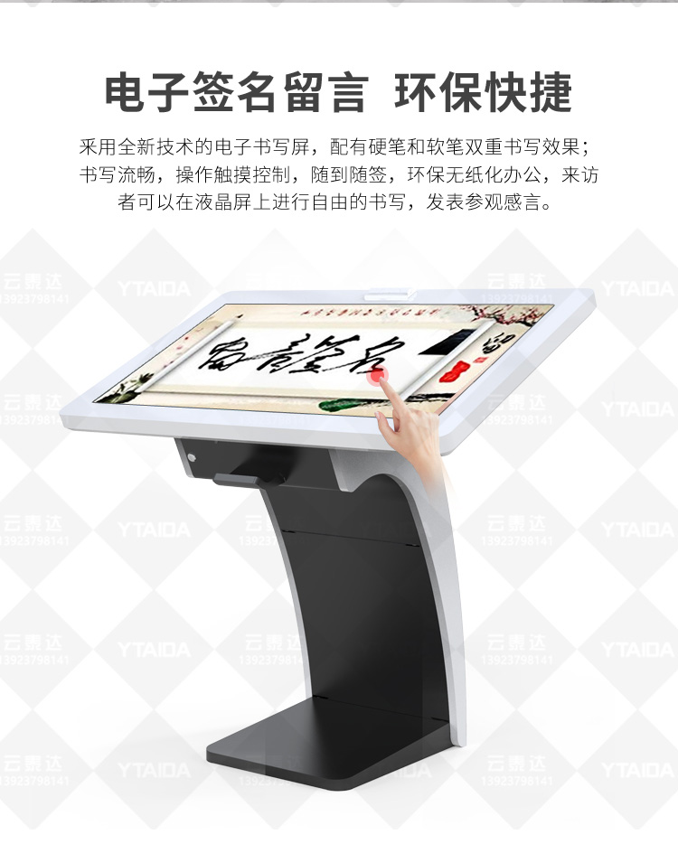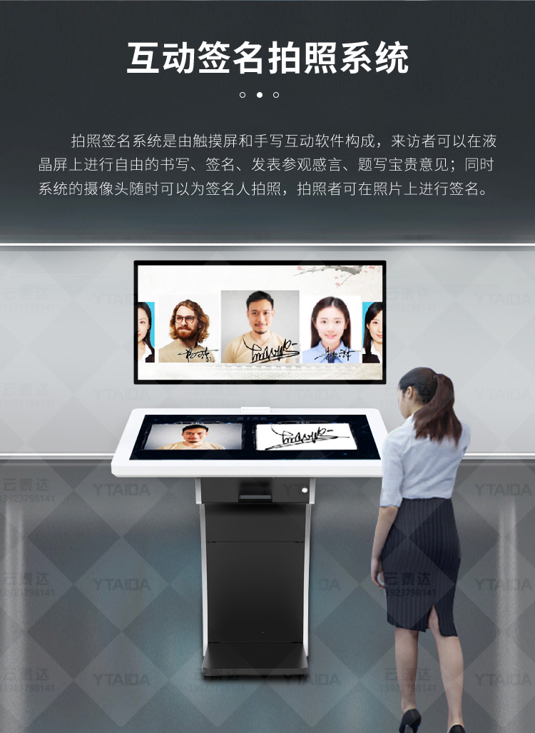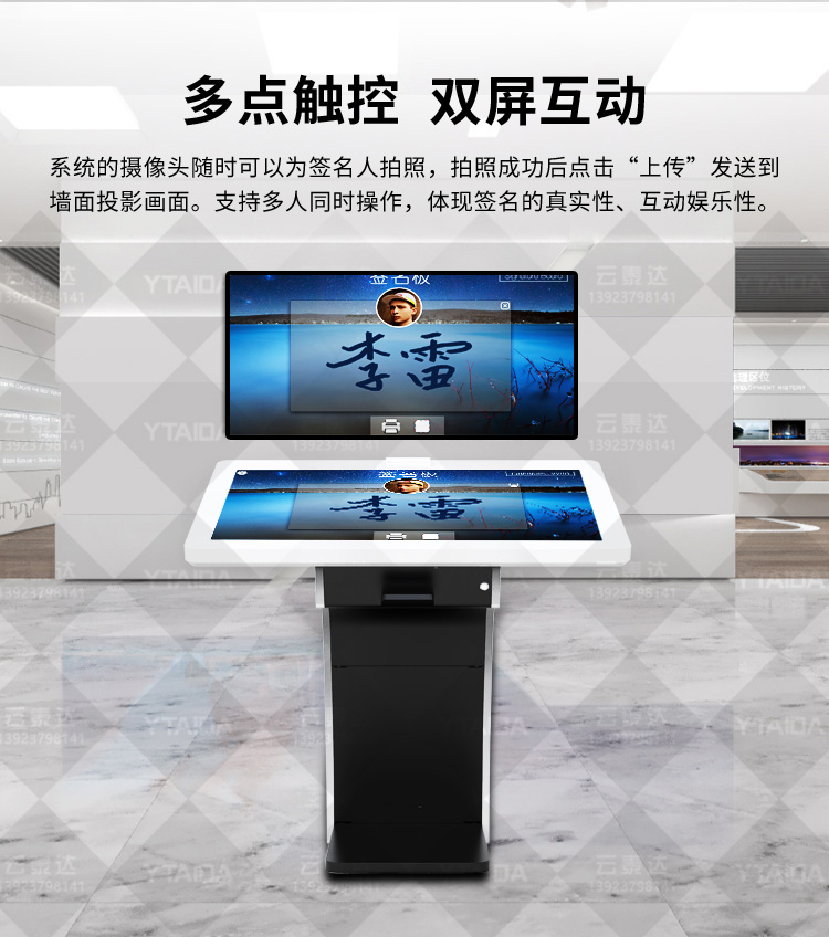 電子簽名拍照系統(tǒng)作為新一代多媒體留言冊,將數(shù)字毛筆簽名影像捕捉、影像合成、配音配樂、多屏顯示技術(shù)、信息統(tǒng)計、實時打印等技術(shù)融為一體,配備多點觸摸屏、大容量硬盤、高清攝像機、外接LED及液晶拼接等大屏幕終端設(shè)備,實現(xiàn)互動的多媒體終端設(shè)備的高科技互動產(chǎn)品。來訪者可以在液晶屏上進(jìn)行自由的書寫,發(fā)表參觀感言、提寫寶貴意見、留下紀(jì)念。內(nèi)容由多媒體留言板以錄屏模式記錄存儲,使游客寫畫在手寫屏上的任何文字、圖形或插入的任何圖片都可以被保存至硬盤存儲設(shè)備,并可供館方服務(wù)人員和其他游客查詢、瀏覽。
