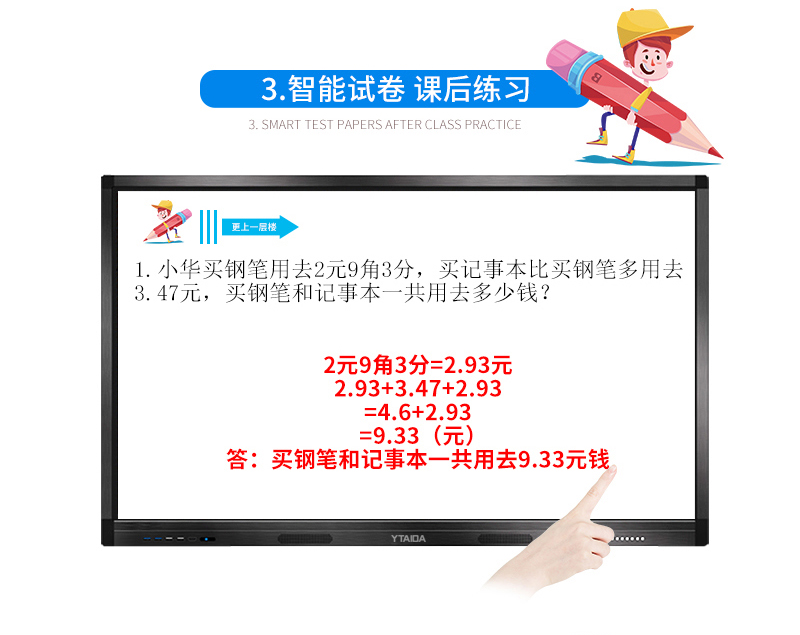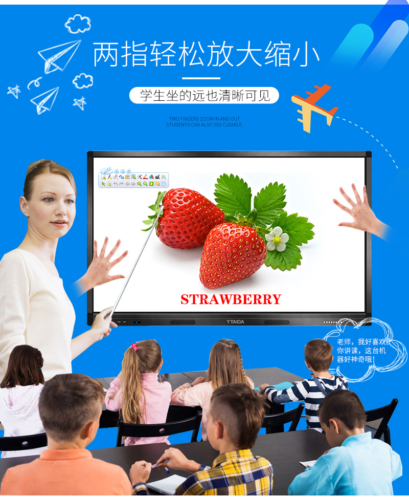 云泰達65寸交互式多點觸摸屏一體機,六機合一(電視、電腦、廣告機、投影儀、電子白板、音響)是一種新型觸摸多媒體教學方案,是將大尺寸的顯示器(LCD/PDP/背投)轉變為一個大型的交互觸摸顯示設備。可完全替代傳統的由投影機、計算機、幕布、音響等組成的交互式電子白板,其特點具有清晰度高、安裝簡便、使用壽命長、無需后期更換耗材、節能等特點。