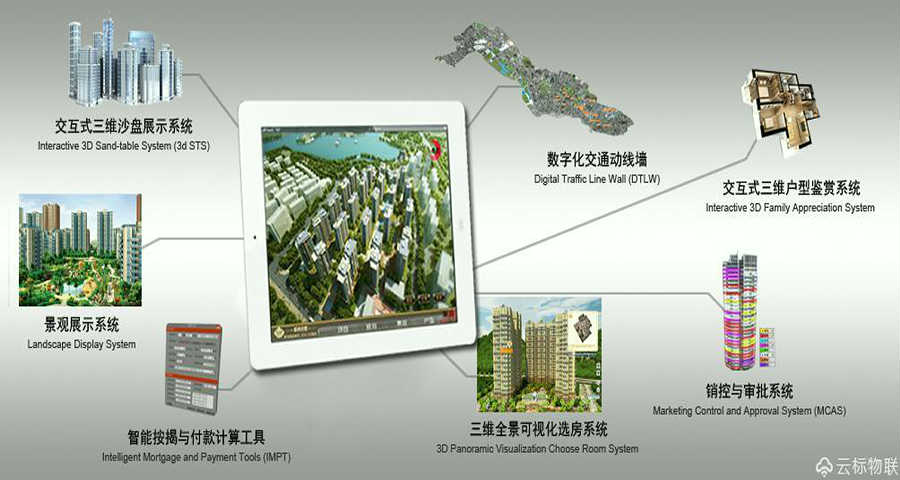 交互式三維沙盤展示系統(tǒng),小區(qū)景觀展示系統(tǒng),智能按揭與付款計算工具,三維全景可視化選房系統(tǒng),數(shù)字化交通動線墻,交互式三維戶型鑒賞系統(tǒng),銷控與審批系統(tǒng).