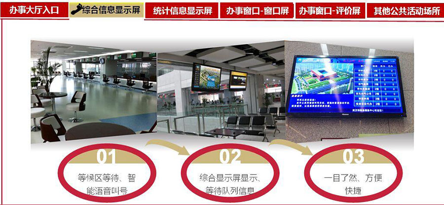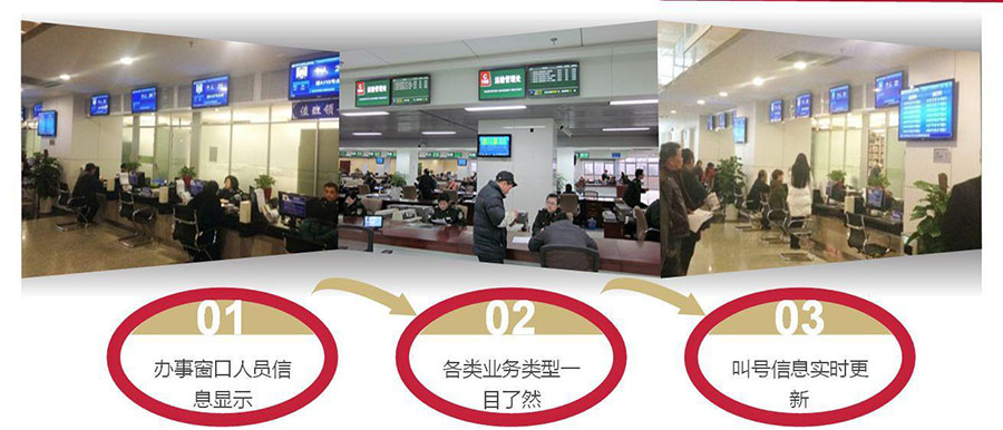 應用說明:窗口辦事內容公示窗口辦事人員信息(從排隊叫號及員工信息庫中抓取),窗口排隊叫號信息,在休息時段顯示業務宣傳,形象展示等信息。